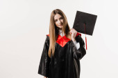 Graduate girl with master degree in black graduation gown and cap on white background. Happy young woman successfully graduated from the university with honors