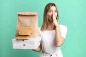Młoda piękna kobieta zdumiona, zszokowana i zdumiona niewiarygodną niespodzianką. dostarczanie i odbieranie koncepcji żywności