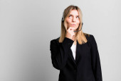 Młoda, ładna kobieta uśmiechnięta ze szczęśliwym, pewnym siebie wyrazem twarzy z ręką na podbródku. Koncepcja akredytacji karty identyfikacyjnej