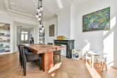 Zdjęcie "Amsterdam, Holandia - 10 kwietnia 2021: salon z zielonymi ścianami i drewnianą podłogą, w tym duży stół jadalny otoczony dwoma czarnymi krzesłami" może być wykorzystywane do celów osobistych i komercyjnych zgodnie z warunkami zakupionej licencji Royalty-free. Obraz jest dostępny do pobrania w jakości wysokiej rozdzielczości do 5760x3840.