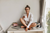 Zdjęcie "Ładna, stylowa, biała kobieta pozująca na kamerę siedzącą na stole z nogami skrzyżowanymi na stole w białym pokoju. Blondynka nosi białą koszulę z kawą i notatnikiem. Koncepcja piękna i młodzieży" może być wykorzystywane do celów osobistych i komercyjnych zgodnie z warunkami zakupionej licencji Royalty-free. Obraz jest dostępny do pobrania w jakości wysokiej rozdzielczości do 5760x3840.