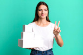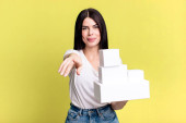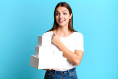 young pretty woman smiling happily with friendly and offering and showing a concept. blank white boxes