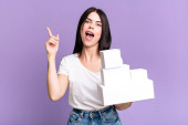 młoda piękna kobieta czuje się szczęśliwa i stoi przed wyzwaniem lub świętowanie. puste białe pudełka