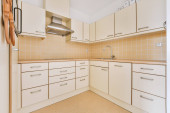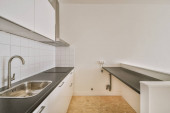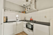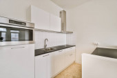 Zdjęcie "Amsterdam, Holandia - 10 kwietnia 2021 r.: mała kuchnia z piekarnikiem i zmywarką na blacie w środku jest bardzo czysta, biała" może być wykorzystywane do celów osobistych i komercyjnych zgodnie z warunkami zakupionej licencji Royalty-free. Obraz jest dostępny do pobrania w jakości wysokiej rozdzielczości do 5760x3840.