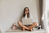 Zdjęcie "Zdjęcie pięknej białej kobiety siedzącej przy stole w słoneczny poranek. Blondynka patrząca w kamerę z laptopem w białej koszuli. Pojęcie pracy w domu, styl życia" może być wykorzystywane do celów osobistych i komercyjnych zgodnie z warunkami zakupionej licencji Royalty-free. Obraz jest dostępny do pobrania w jakości wysokiej rozdzielczości do 5760x3840.