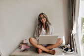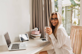 Zdjęcie pięknej białej kobiety siedzącej przy stole w słoneczny poranek. Blondynka patrząca w kamerę z laptopem w białej koszuli. Pojęcie pracy w domu, styl życia