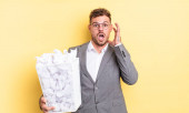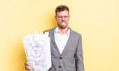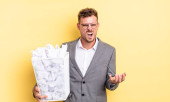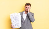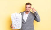 young adult caucasian man feeling puzzled and confused, scratching head with a paper balls trash concept
