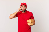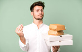 młody dorosły mężczyzna rasy kaukaskiej czuje obrzydzenie, podrażnienie i język na wierzchu. zabrać szybko żywności koncepcja dostawcę