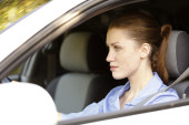 Niezadowolona kobieta za kierownicą wygodnego samochodu się kłóci. Nowoczesna dziewczyna prowadzi..