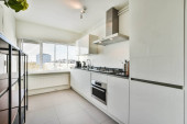 Zdjęcie "kuchnia z białymi szafkami i czarnymi blatami na ladzie na tym zdjęciu jest robiona od wewnątrz" może być wykorzystywane do celów osobistych i komercyjnych zgodnie z warunkami zakupionej licencji Royalty-free. Obraz jest dostępny do pobrania w jakości wysokiej rozdzielczości do 5760x3840.