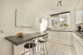 kuchnia z białymi szafkami i czarnymi blatami na ladzie na tym zdjęciu jest robiona od wewnątrz