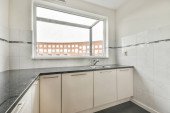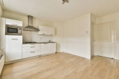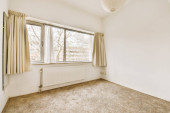 pusty pokój z białymi zasłonami na oknach i szarą wykładziną przed dwoma dużymi oknami