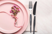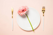 Ustawienie stołu z pięknymi gerbera kwiaty na różowym tle