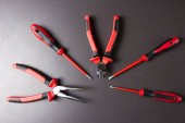 Zestaw różnych szczypiec i śrubokrętów na drewnianym tle. Widok z góry, przestrzeń kopiowania