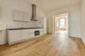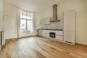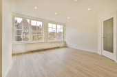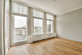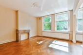 pusty salon z drewnianą podłogą i dużymi oknami wychodzącymi na drzewa w oddali od okna