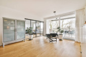 pokój dzienny z przesuwanymi szklanymi drzwiami, które otwierają się na patio i podwórko przed domem
