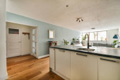 Zdjęcie "pokój dzienny z drewnianą podłogą i telewizorem z płaskim ekranem zamontowanym na ścianie przed kanapą" może być wykorzystywane do celów osobistych i komercyjnych zgodnie z warunkami zakupionej licencji Royalty-free. Obraz jest dostępny do pobrania w jakości wysokiej rozdzielczości do 5760x3840.