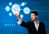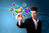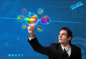 biznesmen, naciskając przycisk mediów społecznych na mapy cyfrowej