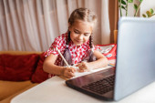 Cute little girl learning art lesson online on a laptop. Virtual drawing painting class on video. Distant remote video education. Modern homeschool study.