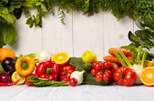 Owoców i warzyw granic na drewnianym stole