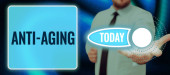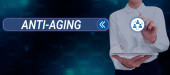 Podpis tekstowy przedstawiający Anti Aging, Concept znaczenie Produkt zaprojektowany, aby zapobiec pojawieniu się starzenia