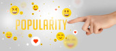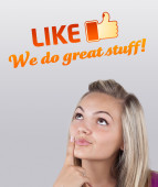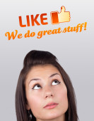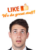 Close-Up przyciętej dłoni wskazując na napis LIKE US, Koncepcja social media