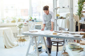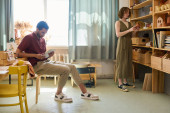 Zdjęcie "Młoda para międzyrasowa w stroju casualwear stojąca przy długim drewnianym stole z budką dj i miksującymi dźwiękami podczas tworzenia nowej muzyki" może być wykorzystywane do celów osobistych i komercyjnych zgodnie z warunkami zakupionej licencji Royalty-free. Obraz jest dostępny do pobrania w jakości wysokiej rozdzielczości do 5760x3840.