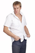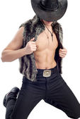 Seksowny muskularny mężczyzna w kapeluszu, santa claus, śmiejąc się
