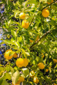 Orange tree with ripe juicy fruit among green foliage against blue sky background Growing fruit in a summer garden, orchard, plantation, agricultural farm. Production of citrus fruits in summertime.