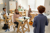 Zdjęcie "Grupa międzyrasowych uczniów szkół średnich w nieformalnych strojach słuchających wyjaśnień nauczycieli na temat nowego przedmiotu, siedzących przy biurkach na lekcjach" może być wykorzystywane do celów osobistych i komercyjnych zgodnie z warunkami zakupionej licencji Royalty-free. Obraz jest dostępny do pobrania w jakości wysokiej rozdzielczości do 5760x3840.