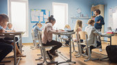 Grupa międzyrasowych uczniów szkół średnich w nieformalnych strojach słuchających wyjaśnień nauczycieli na temat nowego przedmiotu, siedzących przy biurkach na lekcjach