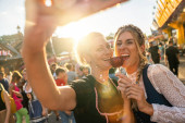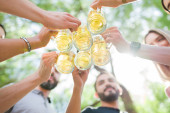 Przyjaciele pijący tosty i pijący piwo w ogrodzie piwnym. Przyjaźń styl życia i impreza na festiwalu Oktoberfest, folku lub piwa, z jasnym słońcem