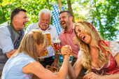 Grupa ludzi w odpowiednim Tracht toasting i picia w bawarskim ogrodzie piwnym latem