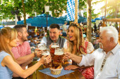 Para całujących się i uśmiechniętych przed kamerą mówi na zdrowie lub brzęczące kieliszki z kubkiem piwa w bawarskim ogrodzie piwnym lub na festiwalu oktoberfest