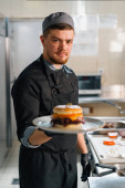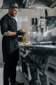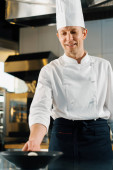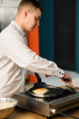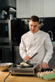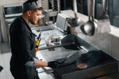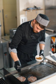 Szef kuchni w czarnych rękawiczkach przygotowuje smaczne paszteciki burger hot pan w profesjonalnej kuchni