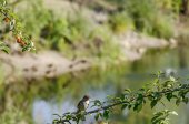 Whinchat Siched on Acacia Branch Against niewyraźne jezioro