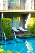 Luksusowy 5-gwiazdkowy hotel basen w Azji. Para mężczyzn i kobiet na wakacjach w luksusowym hotelu, kaukascy mężczyźni i tajlandzkie kobiety przy basenie
