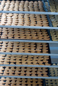 Ogromna linia fabryczna do produkcji słodkiej żywności i ciasteczek. Zbliżenie ujęć procesu produkcji przemysłowej.