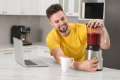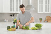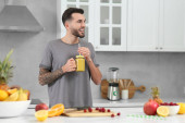 Handsome man with delicious smoothie at white marble table in kitchen