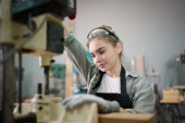 Zdjęcie "Młoda piękna kobieta pracuje w warsztatowej pracowni cieśli DIY. Właścicielka małej firmy, młoda kobieta pracująca w fabryce mebli." może być wykorzystywane do celów osobistych i komercyjnych zgodnie z warunkami zakupionej licencji Royalty-free. Obraz jest dostępny do pobrania w jakości wysokiej rozdzielczości do 5760x3840.