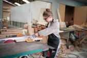 Zdjęcie "Młoda piękna kobieta pracuje w warsztatowej pracowni cieśli DIY. Właścicielka małej firmy, młoda kobieta pracująca w fabryce mebli." może być wykorzystywane do celów osobistych i komercyjnych zgodnie z warunkami zakupionej licencji Royalty-free. Obraz jest dostępny do pobrania w jakości wysokiej rozdzielczości do 5760x3840.