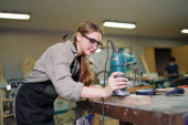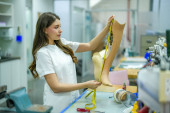 Mały interes młodej kobiety. Piękna młoda pracownica w pracowni mebli