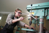 Mały interes młodej kobiety. Piękna młoda pracownica w pracowni mebli