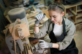 Mały interes młodej kobiety. Piękna młoda pracownica w pracowni mebli