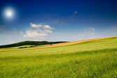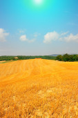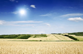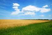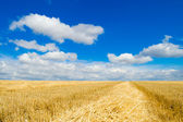 koszenie pole pszenicy i niesamowite błękitne niebo, białe chmury.