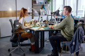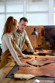 utalentowana, odnosząca sukcesy krawcowa dzieląca się swoim doświadczeniem z klientem, portretem z bliska. młodzież dyskutująca o procesie szycia