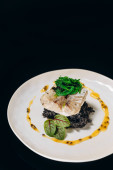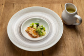 Zdjęcie "Szef kuchni demonstruje nowe danie pozostałym szefom kuchni restauracji. Widzimy jakieś ryby i trochę zieleni na małym talerzu. Wygląda smakowicie i smacznie.." może być wykorzystywane do celów osobistych i komercyjnych zgodnie z warunkami zakupionej licencji Royalty-free. Obraz jest dostępny do pobrania w jakości wysokiej rozdzielczości do 5760x3840.