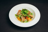 Nowy szef kuchni zrobił nową sałatkę dla gości restauracji. Pyszna nowa sałatka jest robiona w białej misce. Jest gotowy do zjedzenia przez odwiedzających. Jest trochę zieleni, pomidory, mięso, pieprz i oliwka. Wygląda pyszne, niesamowite i smaczne.