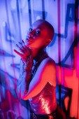 namiętna wytatuowana kobieta w błyszczącej górnej części szyi dotykającej i patrząca na kamerę w pobliżu kolorowych graffiti w niebieskim oświetleniu