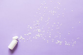 Zestaw różnych białych i brązowych butelek z lekami, makieta, butelki z tabletkami bez etykiety, aerozol do nosa, miejsce na ksero na niebieskim tle